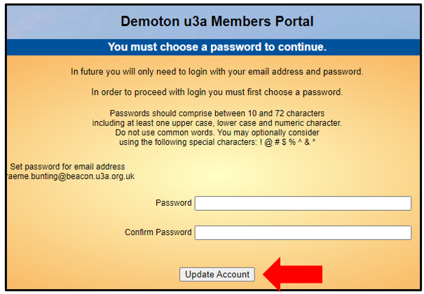 Enter a password which will enable you to login in the future. Don't forget to record the email and password somewhere safe, because you will need them on an annual basis when your renew your Odiham and District u3a membership.